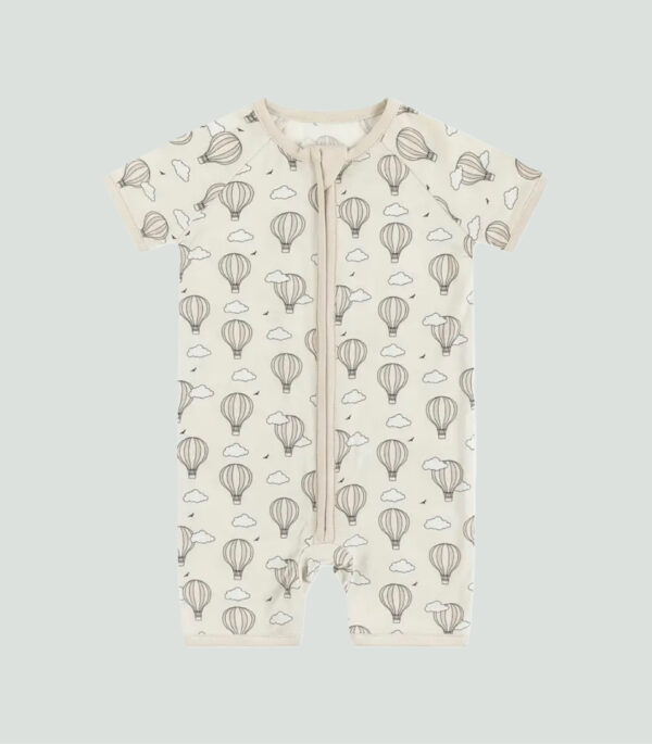 Mono de fibra de bambú manga corta con estampado de globo aerostático, tejido, elástico y muy confortable por su suavidad. Incluye doble cierre para su comodidad.