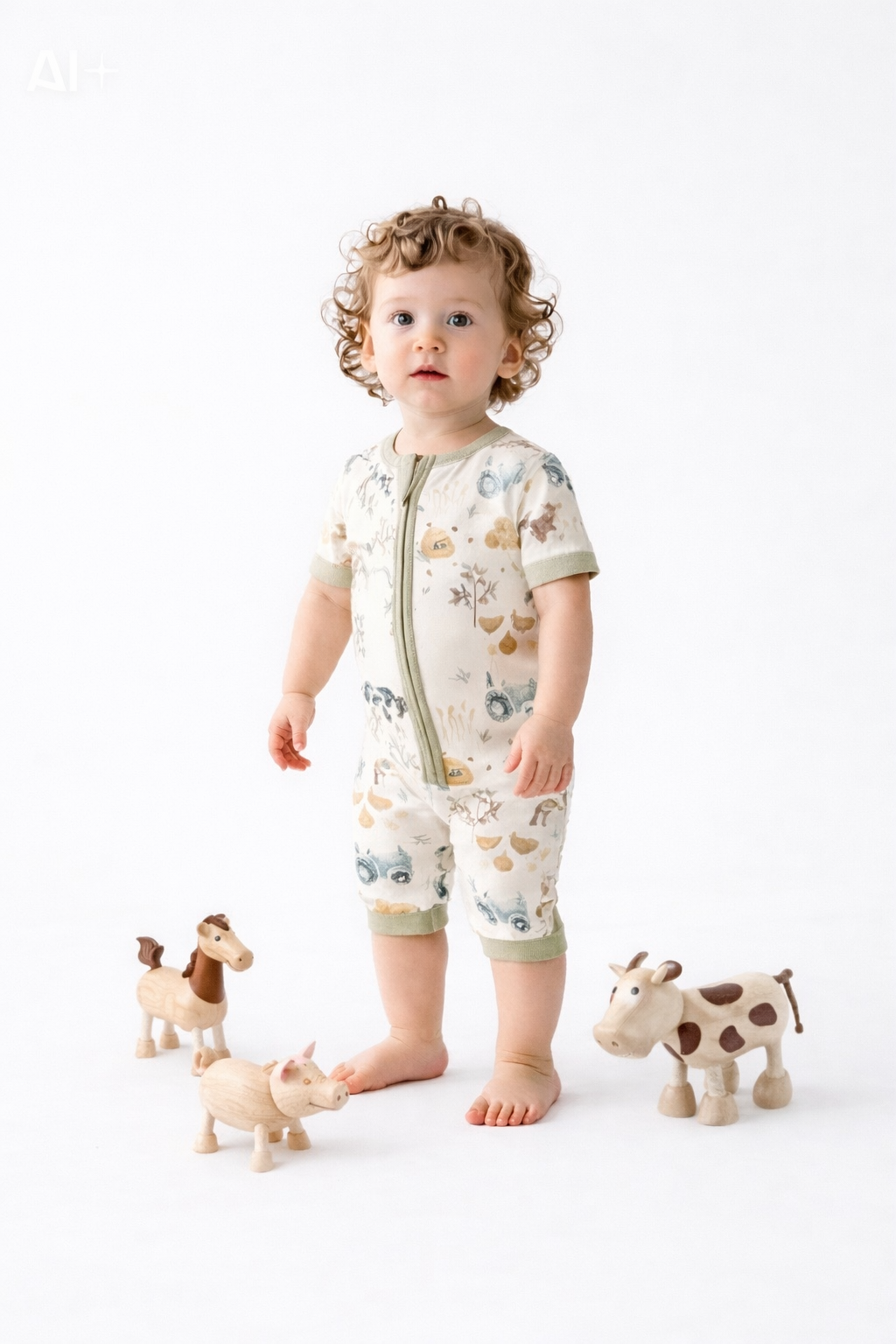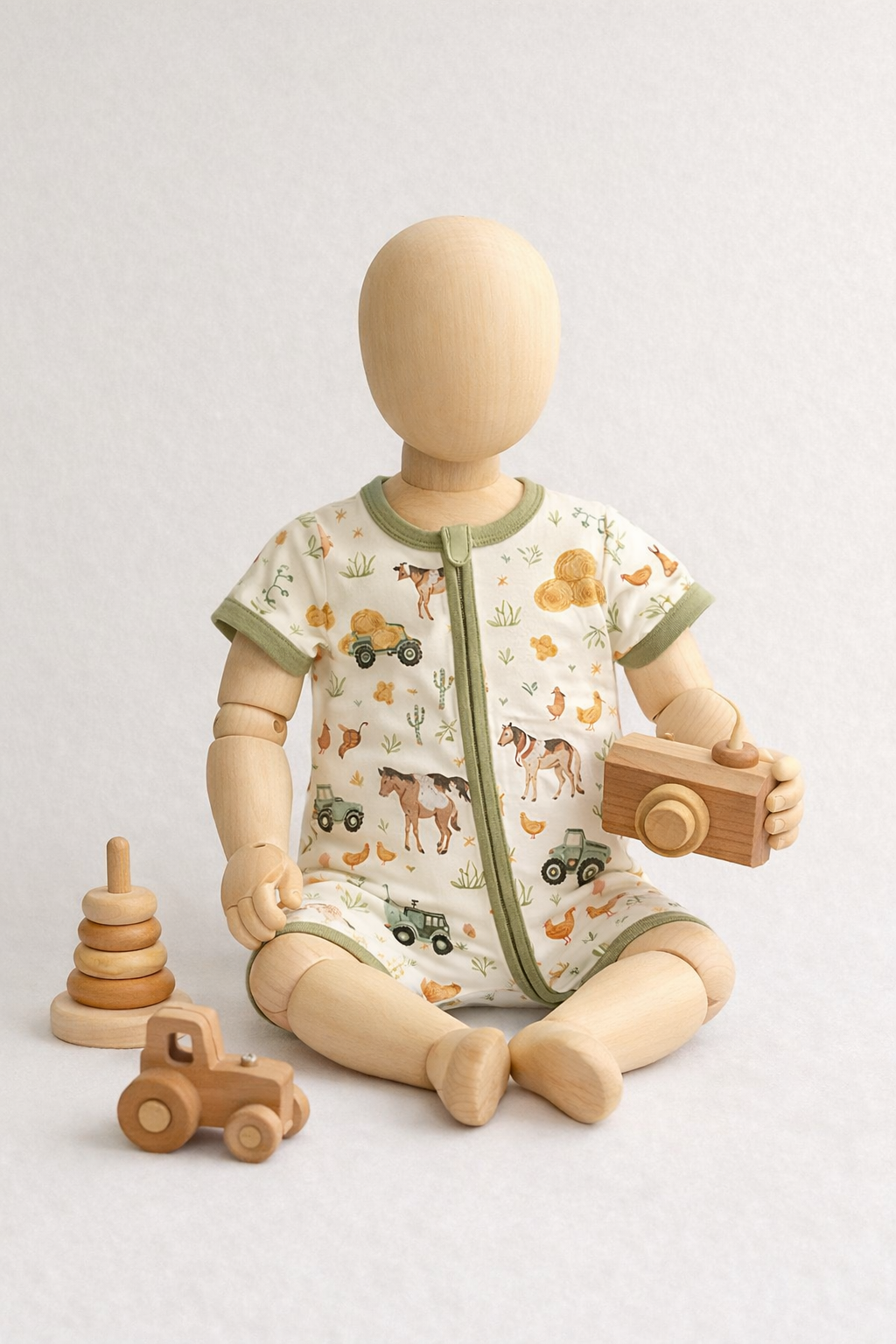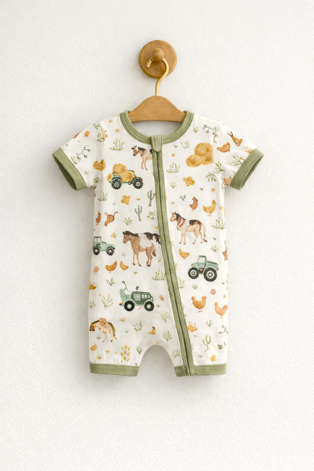 Mono de fibra de bambú manga corta con estampado de granjita, tejido, elástico y muy confortable por su suavidad. Incluye doble cierre para su comodidad.