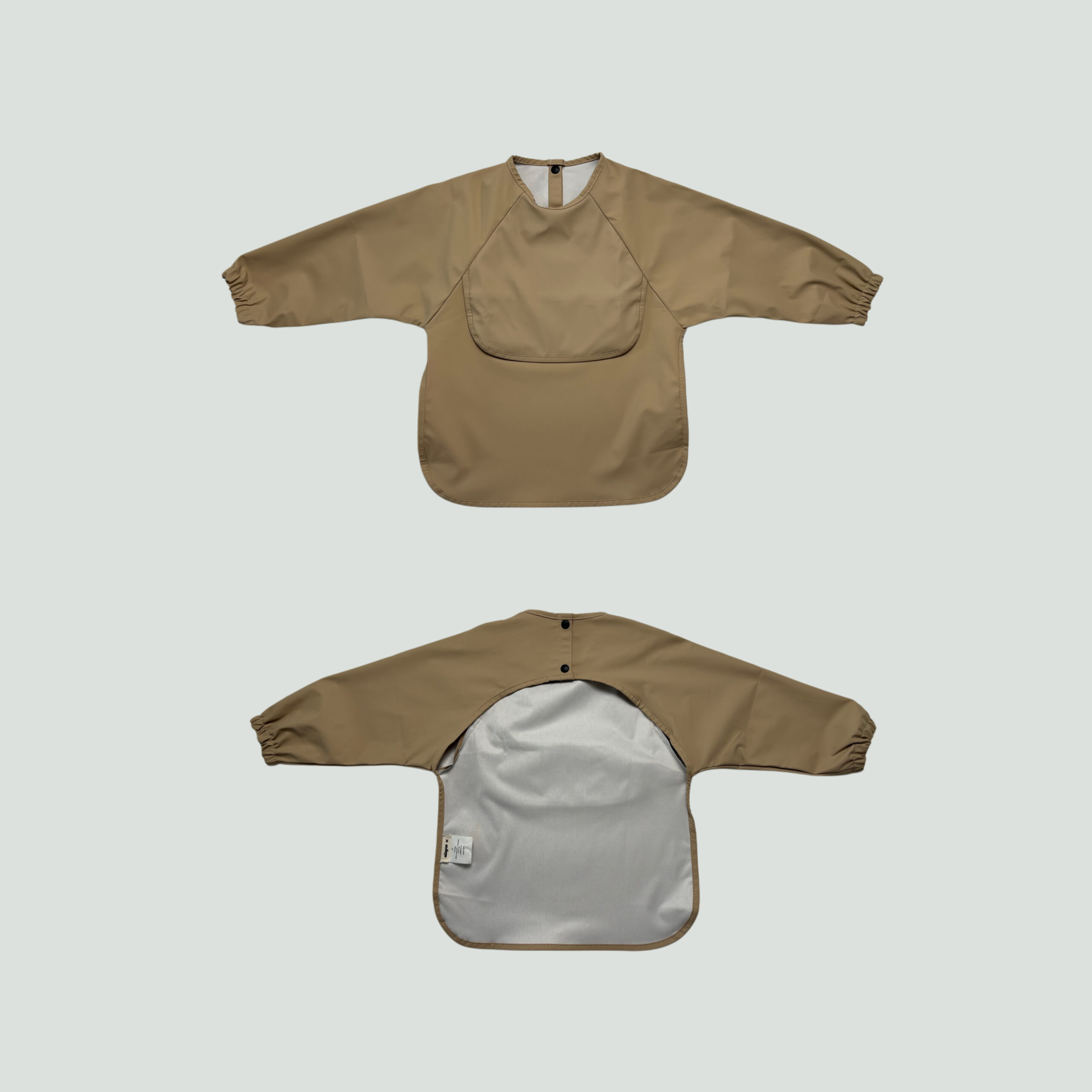 Delantal manga larga ajustable con bolsillo, resistente al agua. Disponible en dos tonos: beige y caramel.