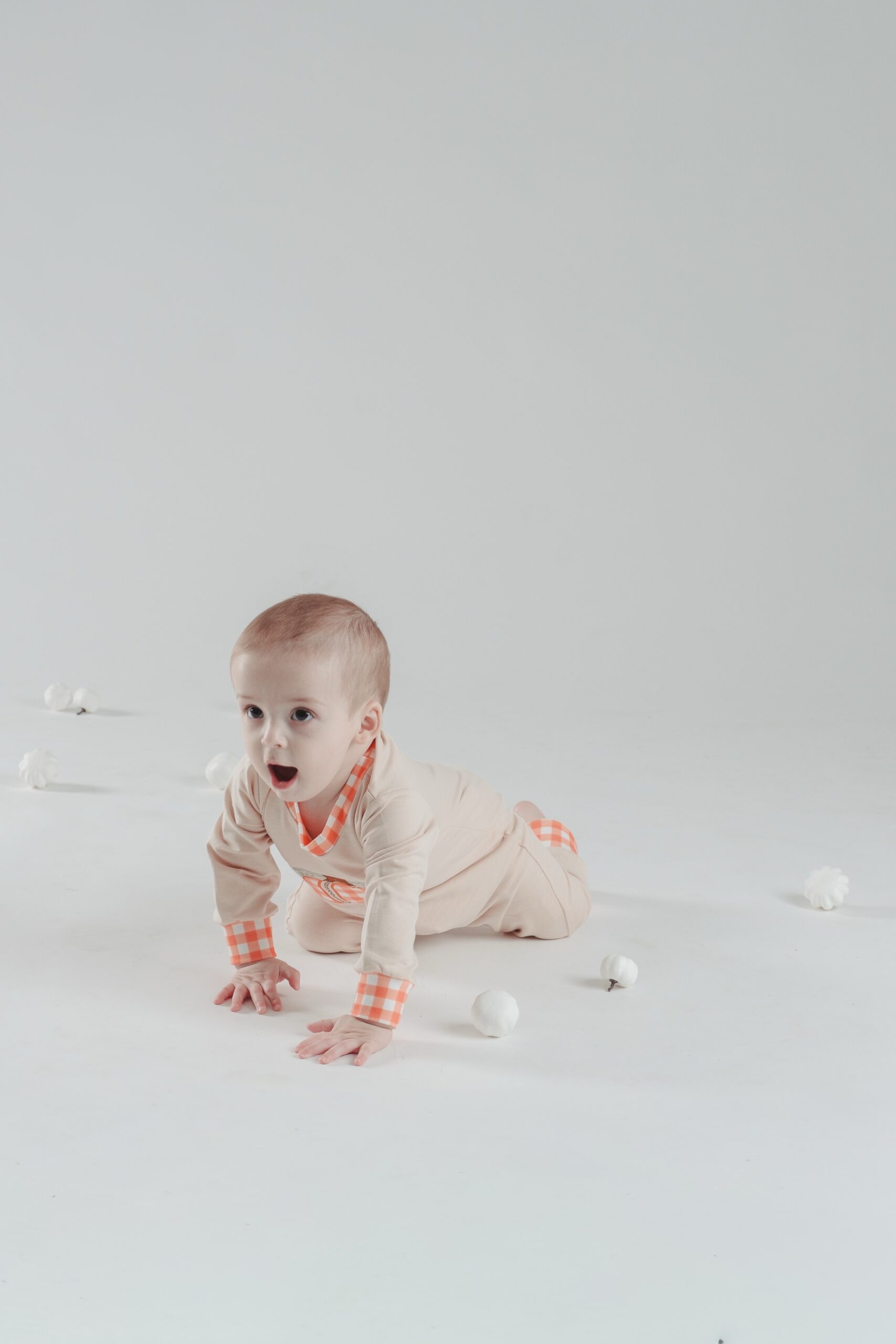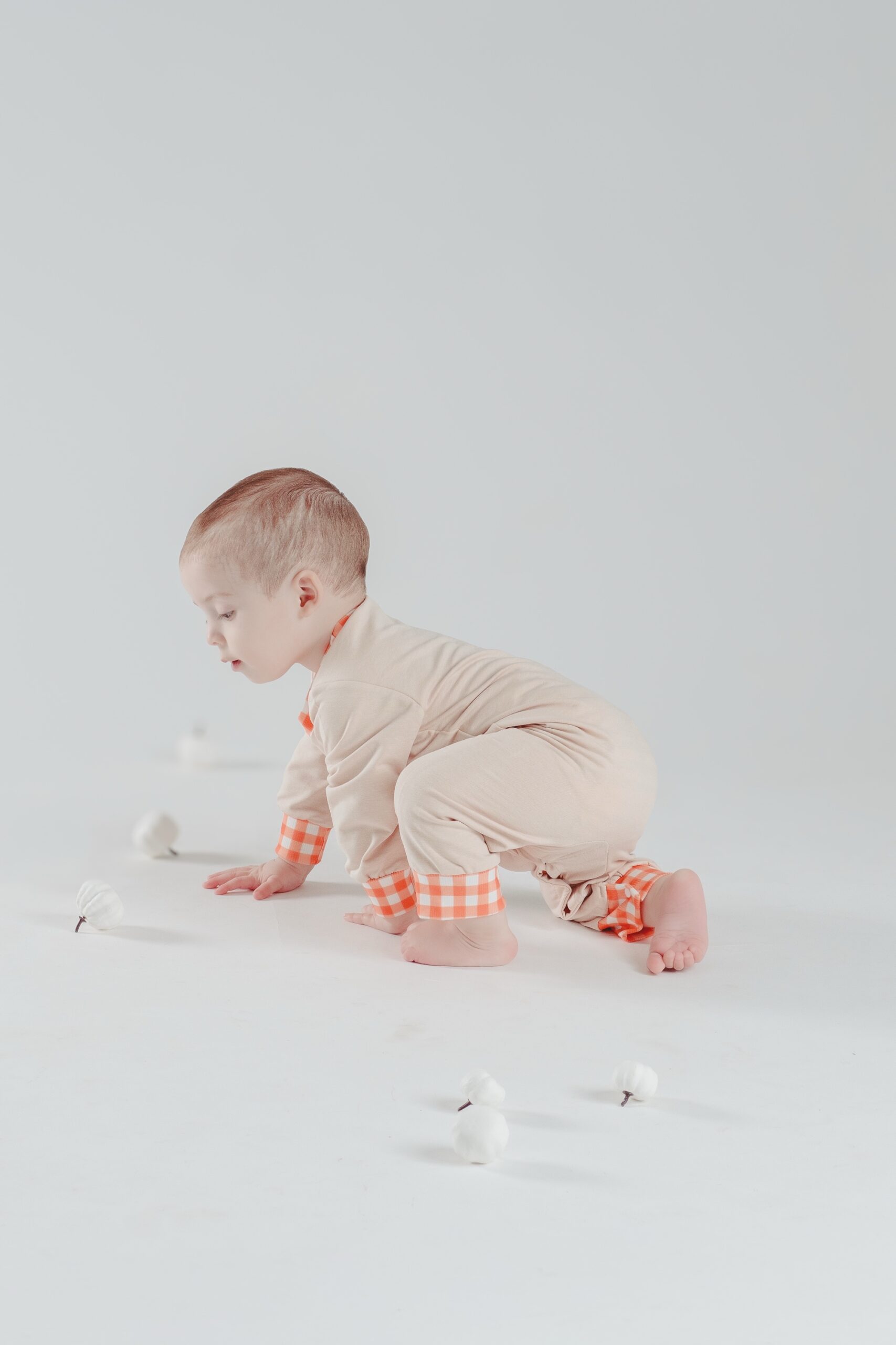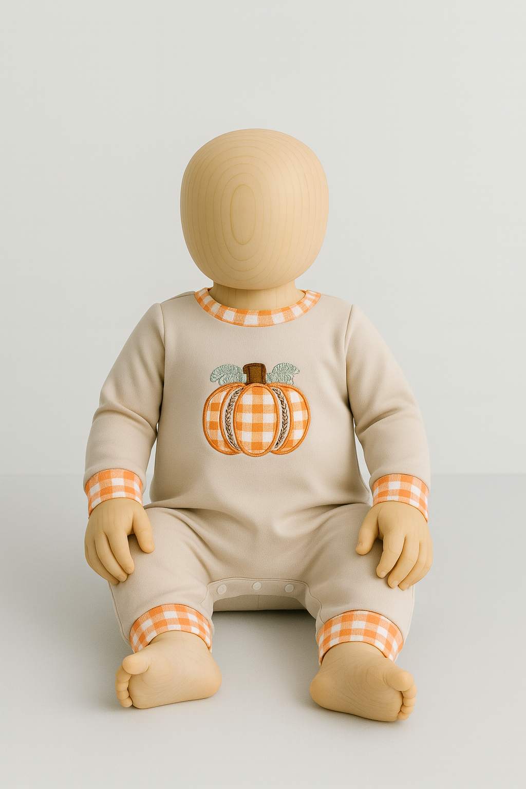 Pelele de algodón al mejor estilo de calabaza y cuadros. Incluye botones para hacer el momento del cambio aún mas cómodo.