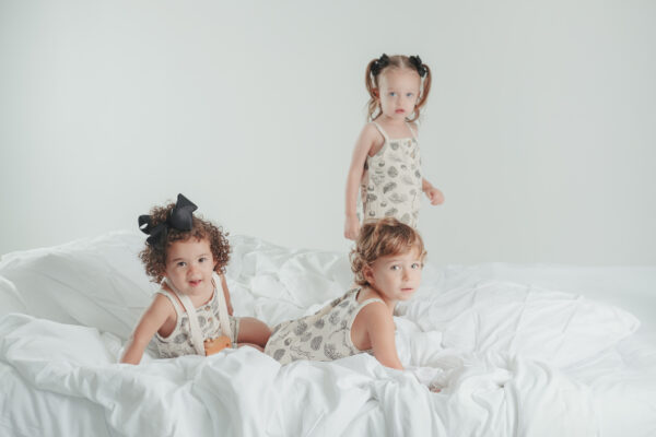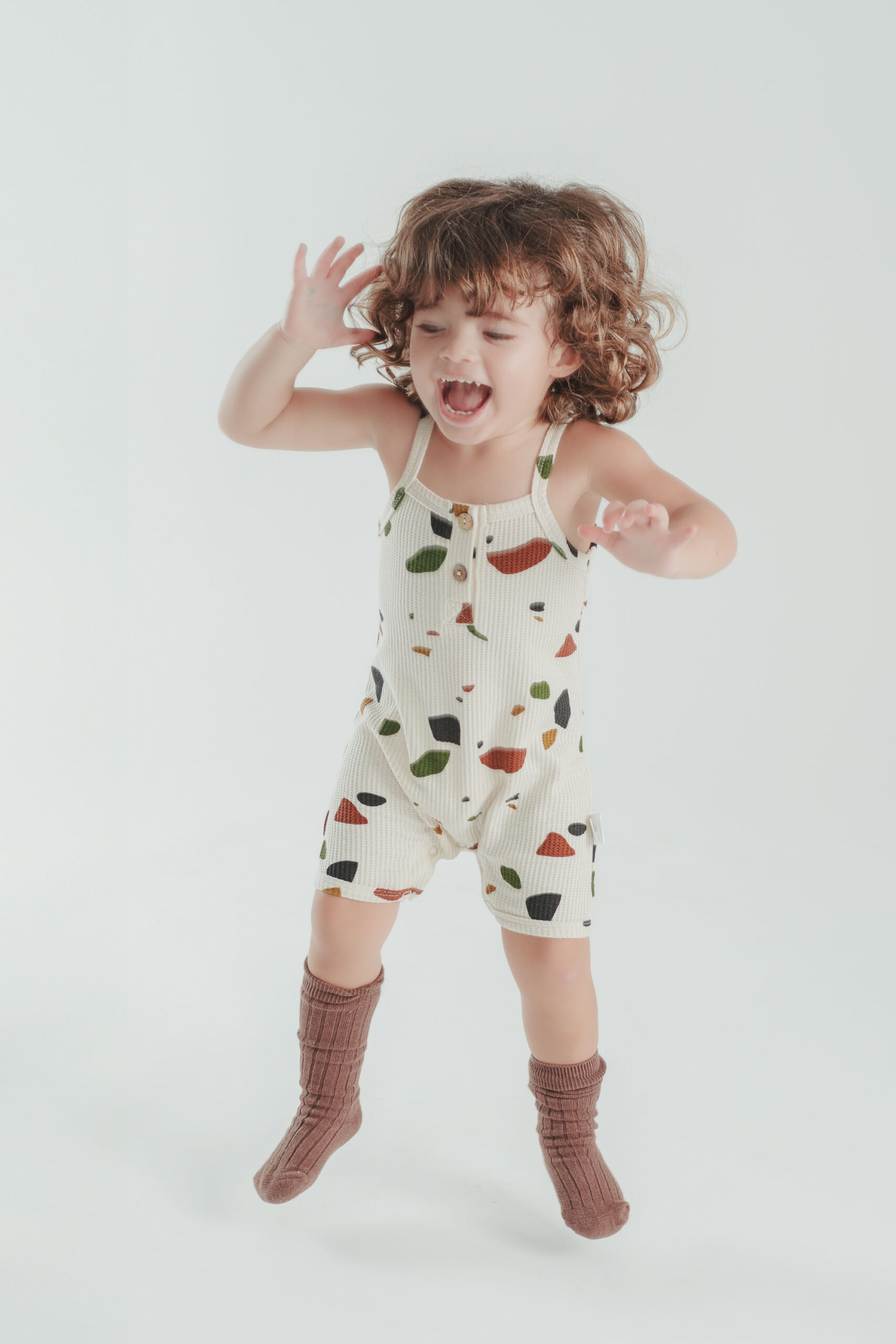 Prenda de una sola pieza, versátil y fresca. Disponible en tres estampados diferentes: manchas, sol y hongos.